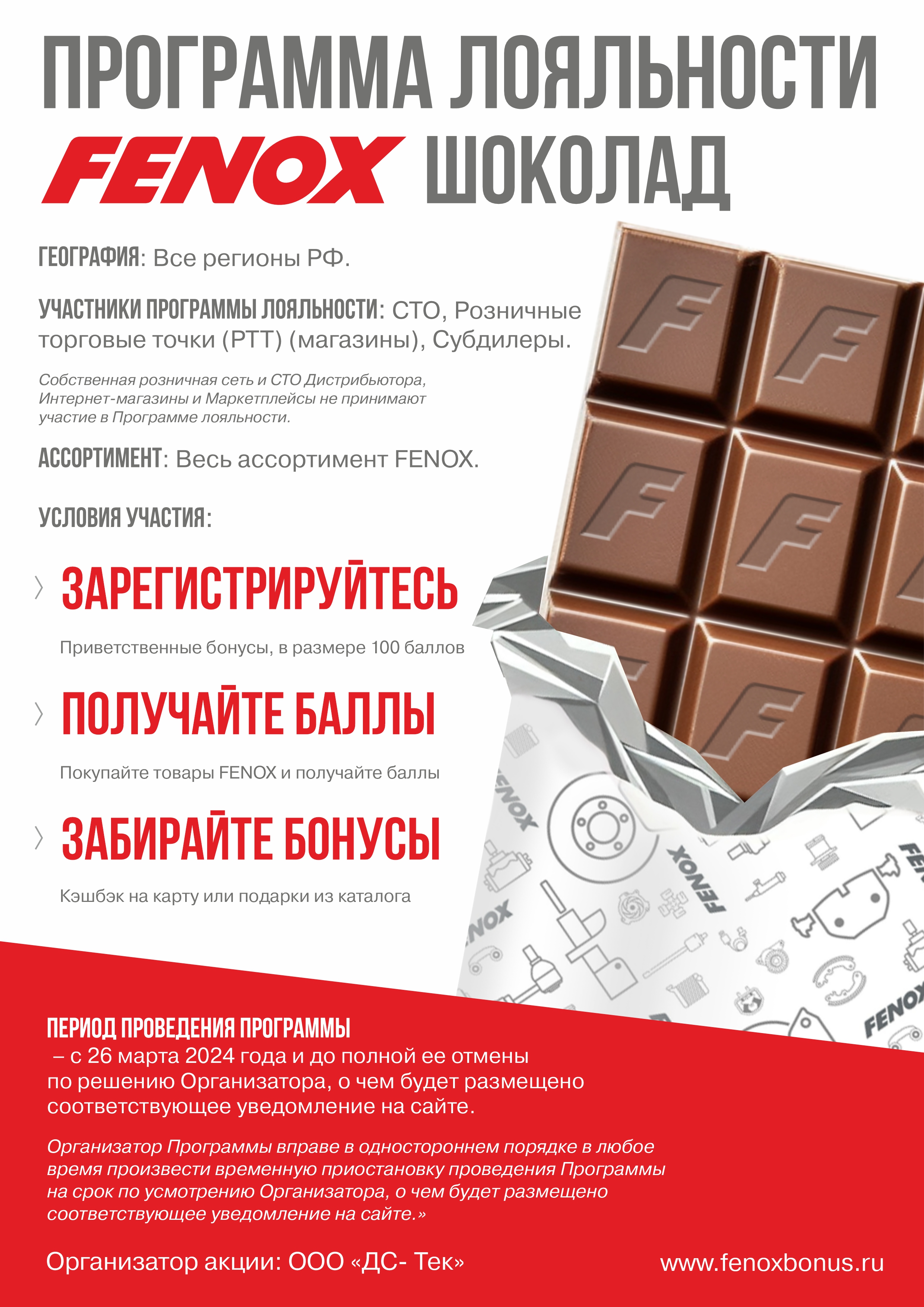 Участвуйте в акции от бренда FENOX – программа лояльности FENOX.ШОКОЛАД! Покупая товары этого бренда получайте баллы и забирайте бонусы: кэшбэк на карту или подарки из каталога!
